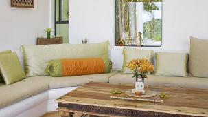 This apartment with nice shades of blue and a beautiful bathroom will help you to relax after work.